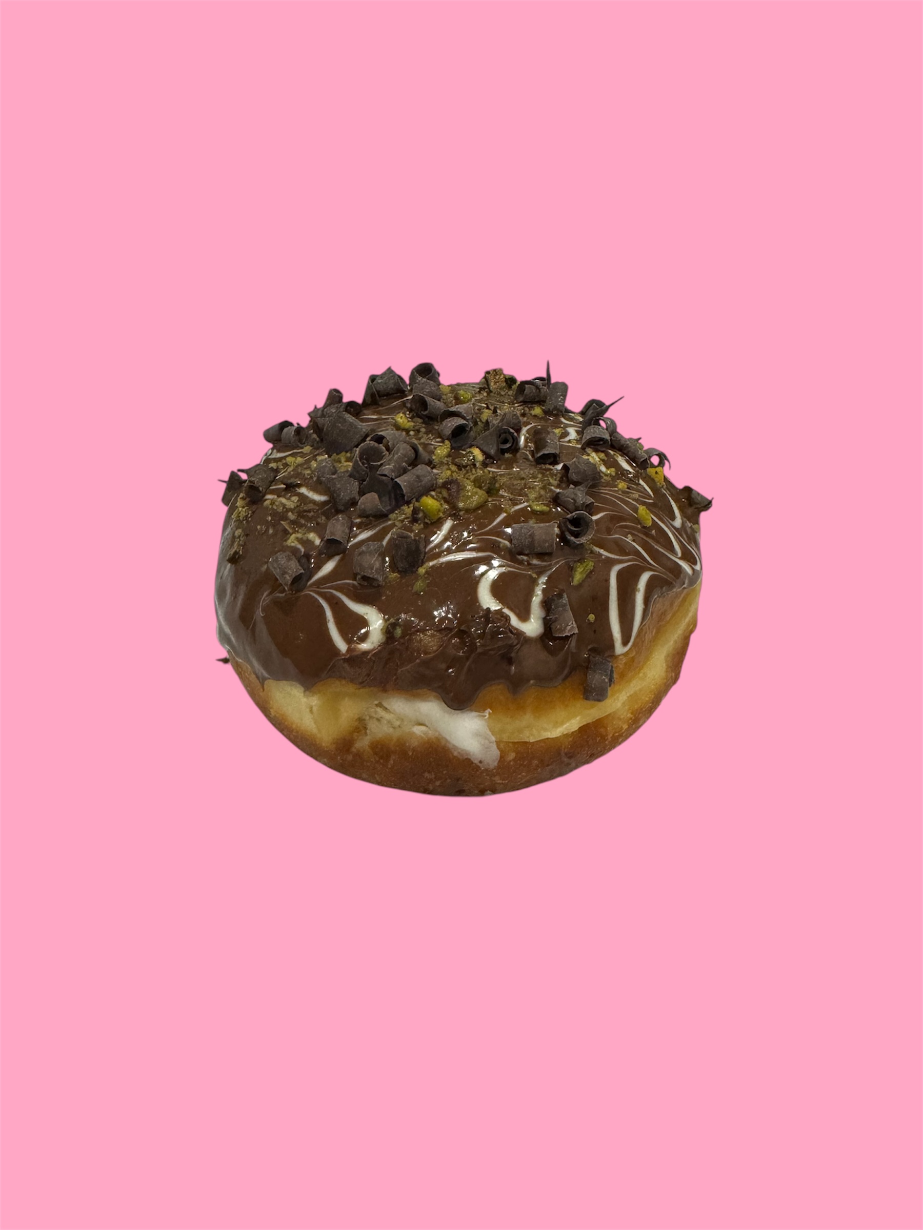 Raised yeast donut filled with ricotta cheese and house made vanilla mousse. Dipped in Nutella, sprinkled with chocolate curls and topped with pistachio.