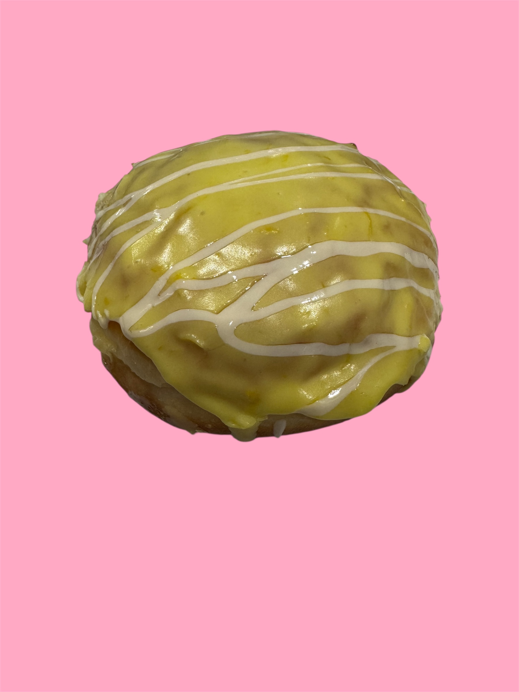 Raised donut filled with lemon cheesecake filling and dipped in a lemon glaze and topped with Graham crackers crumb and drizzled with white chocolate.